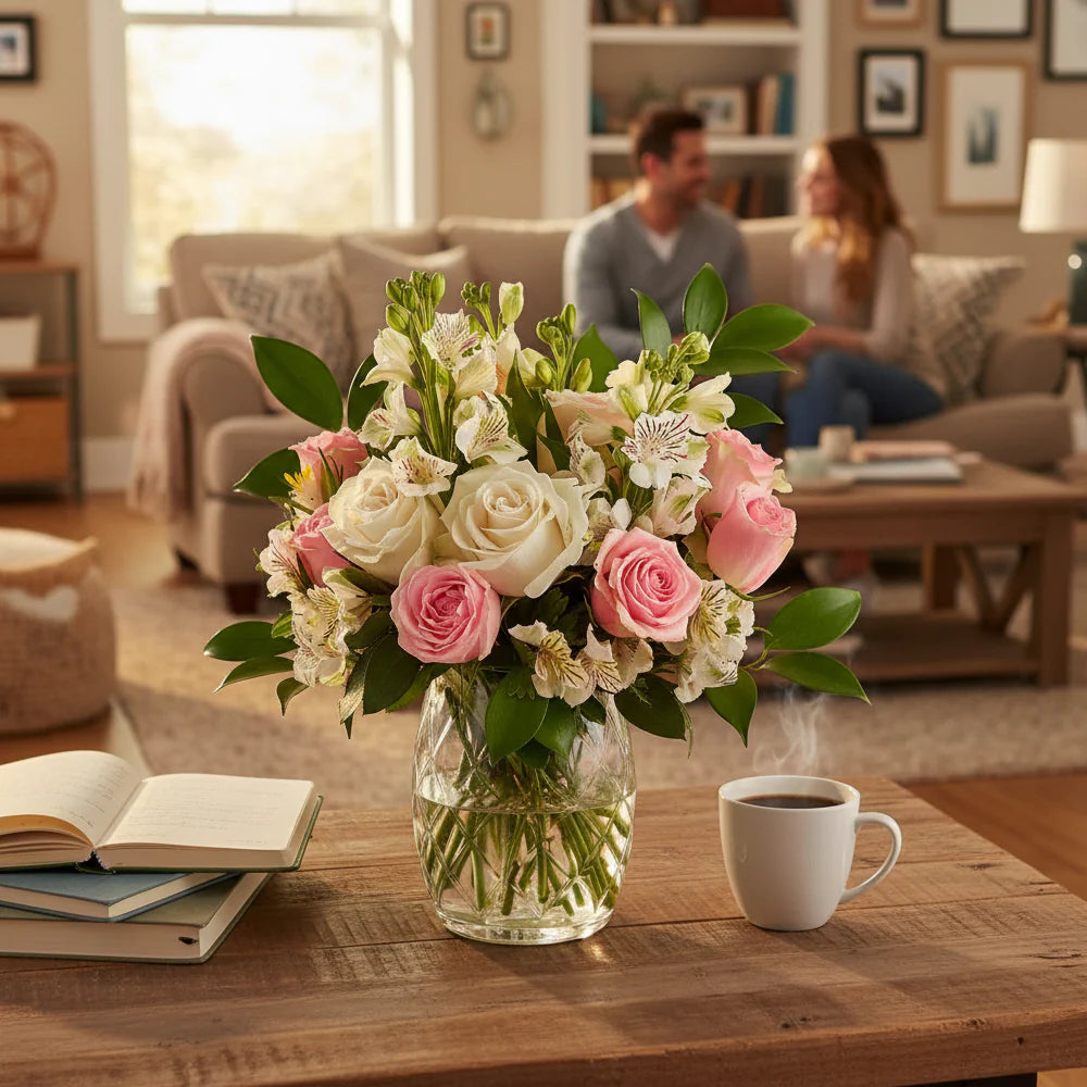 What's included: Hand-arranged white and pink roses, alstroemeria, snapdragons, and fresh greenery.