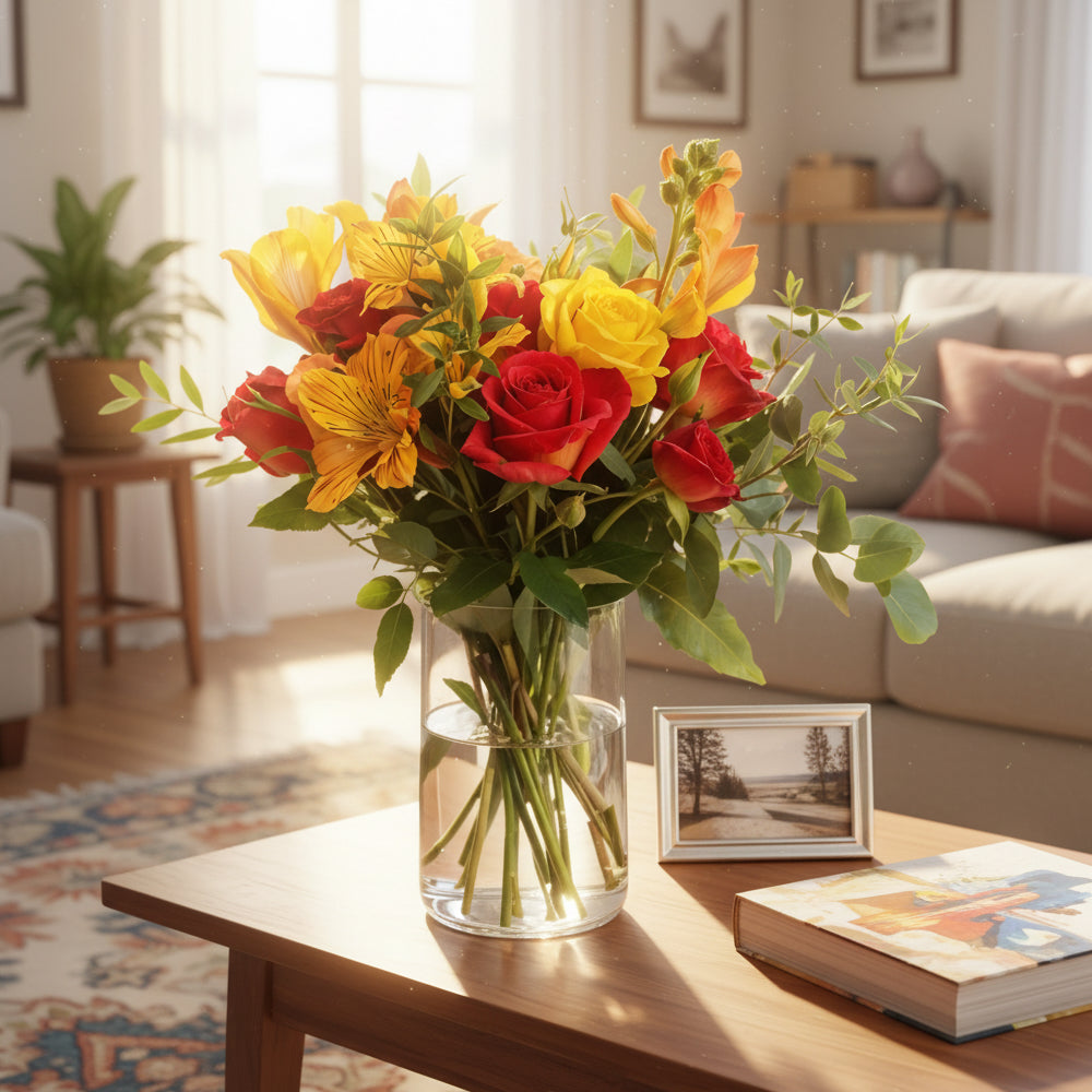 Introducing the "Golden Romance" bouquet, a dazzling floral arrangement that blends timeless beauty with cheerful charm. This stunning bouquet features radiant red and yellow roses paired with vibrant yellow alstroemeria. Perfect for any occasion, the "Golden Romance" bouquet brings warmth and joy into any space, making it an ideal gift for expressing love and happiness.